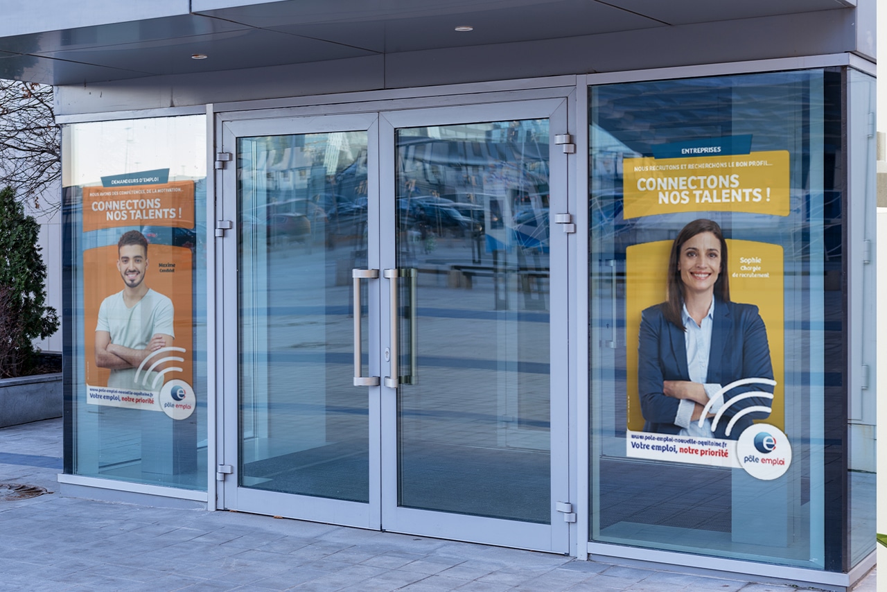 Conception de vitrophanies de devanture d’agence, et de l’identité visuelle du recrutement avec la méthode MRS.